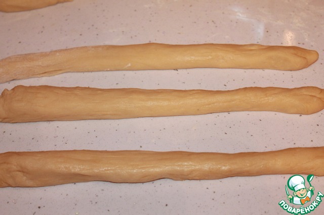 Делим наше тесто на 6 одинаковых частей. С помощью рук, никаких скалок раскатываем на 6 колбасок. Ширина должна быть примерно одинаковая, а вот в длину они должны быть равны. Берем три колбаски соединяем с одной стороны, защипываем и подворачиваем швом вниз, далее плетем косу, не тугую, старайтесь как можно меньше касаться теста. В конце также скрепляем и подворачиваем. Аналогично проделываем с остальными косичками.