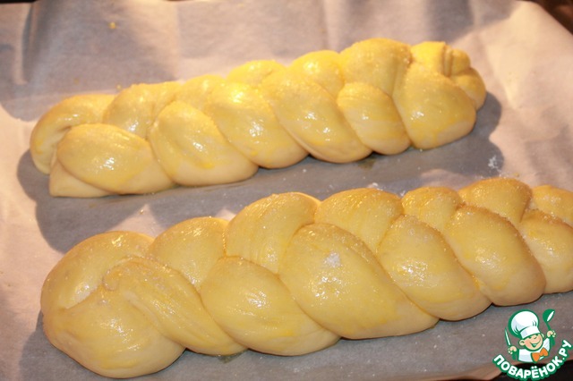 Далее отправляем косички на противень. Если у вашей духовки режим нагревания начинается с 0 гр., то оставьте косички для поднятия в духовке при 30 гр. на 25 - 30 минут, если нет, то отправьте их в теплое место. После того как косички поднимутся смазываем их желтком и посыпаем сахаром, маком, кунжутом, чем вы любите. Духовку включаем на 190 гр. и выпекаем 25 - 30 минут, до готовности.