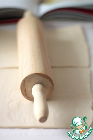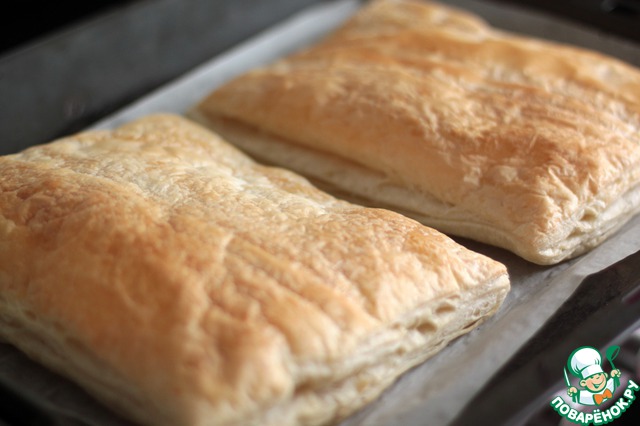Достаем из духовки наше тесто и разделяем каждый пласт на 2 части. Должно получиться 4 куска теста.