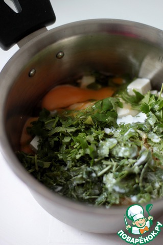 Соедините зелень, обжаренный лук, нарезанную мелко брынзу, 2 яйца и сливки. Замешайте начинку.