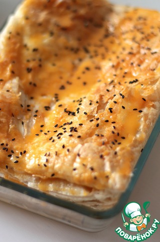 Верхний слой смазываем желтком и посыпаем кунжутом. У меня был черный, он очень эффектно смотрится на золотистом тесте. Отправляем в духовку на 20 минут при температуре 180 градусов.