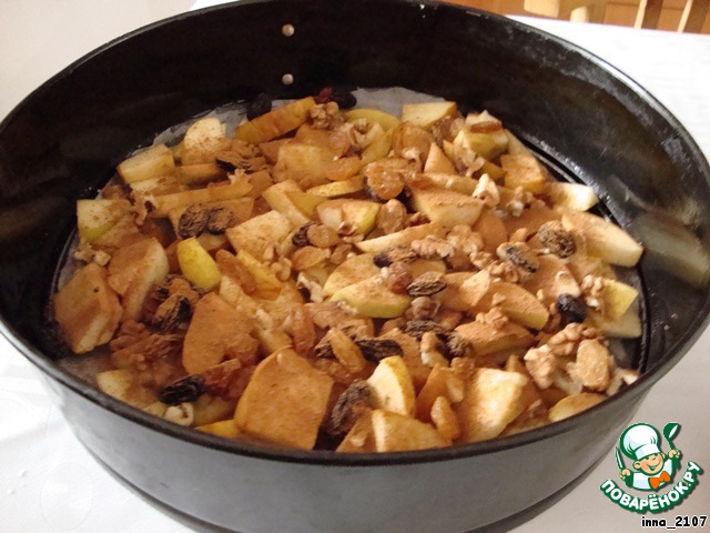 Выложить на нее яблоки, орехи и изюм.
