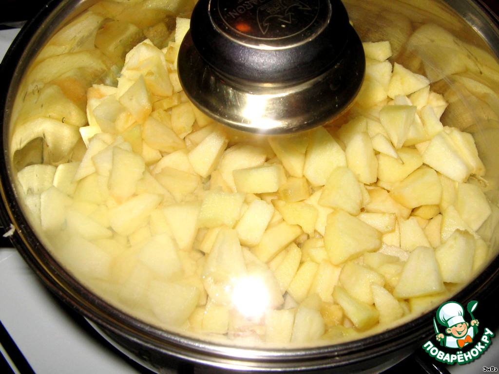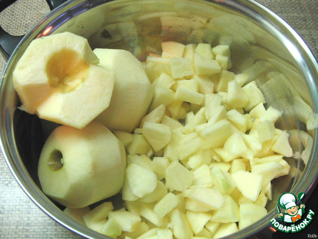 Яблоки чистим, вырезаем семенную коробочку и режем на маленькие кусочки.