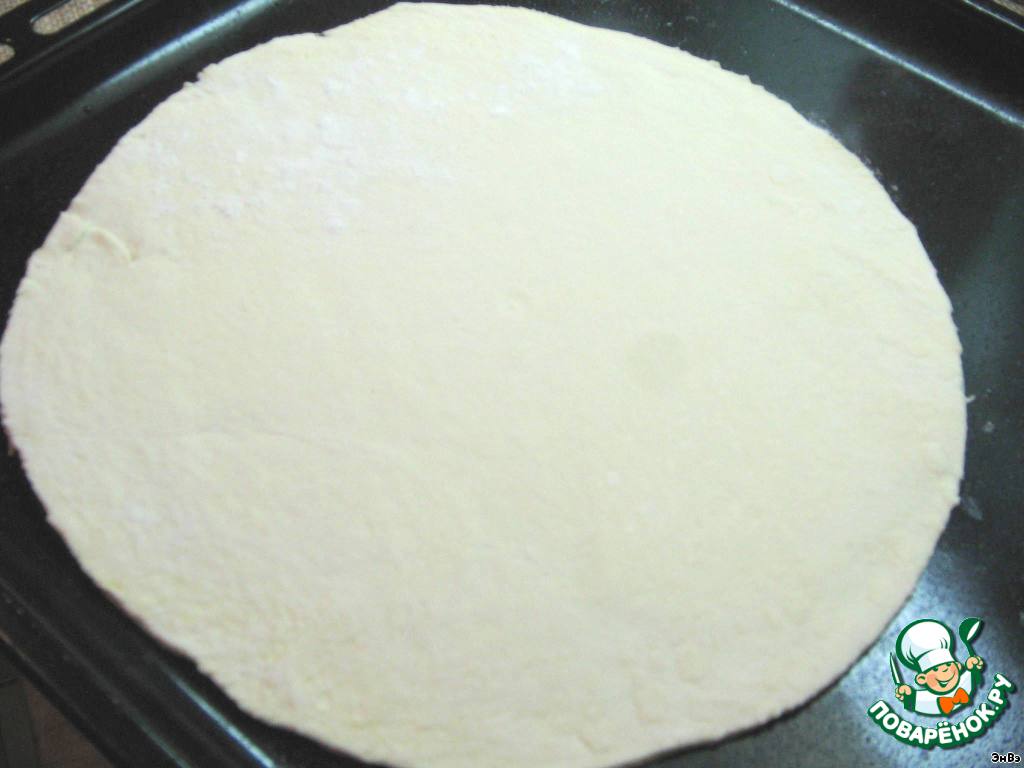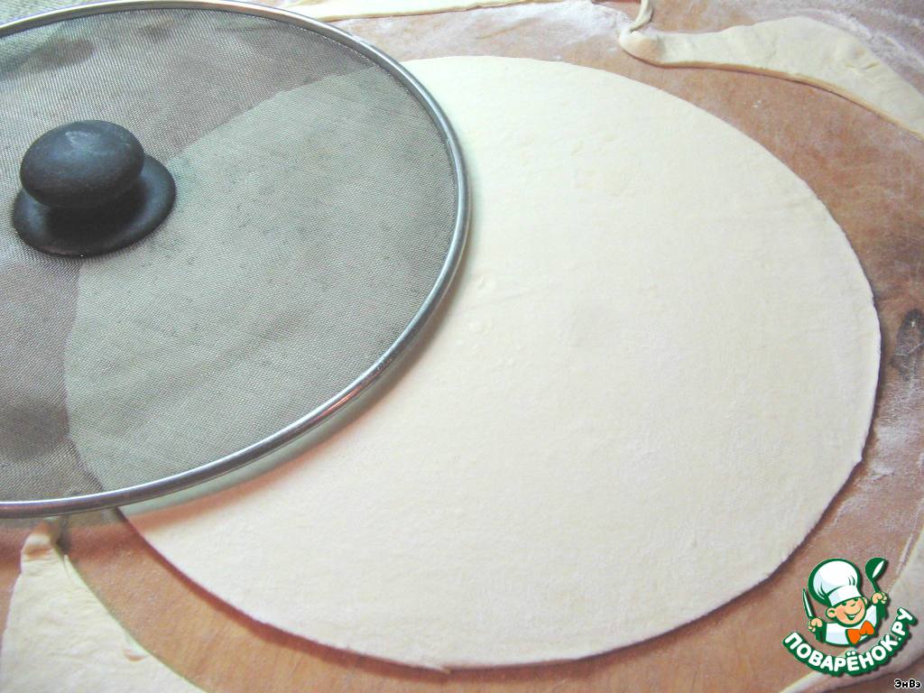 Теперь займемся непосредственно пирогом. Тесто делим на четыре части, раскатываем, при помощи чего-нибудь круглого обрезаем края. У меня диаметр лепешек 28 см.