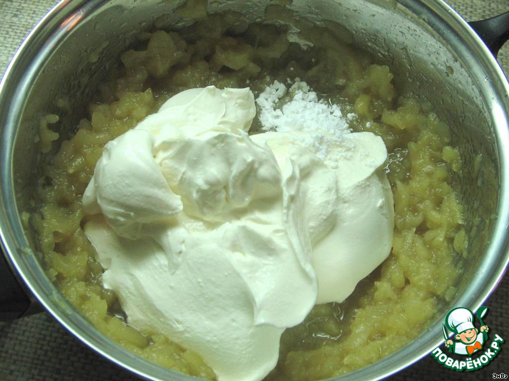 В яблочное пюре выкладываем сметану (сметана должна быть жирной, у меня 25% жирности), добавляем пакетик ванильного сахара.