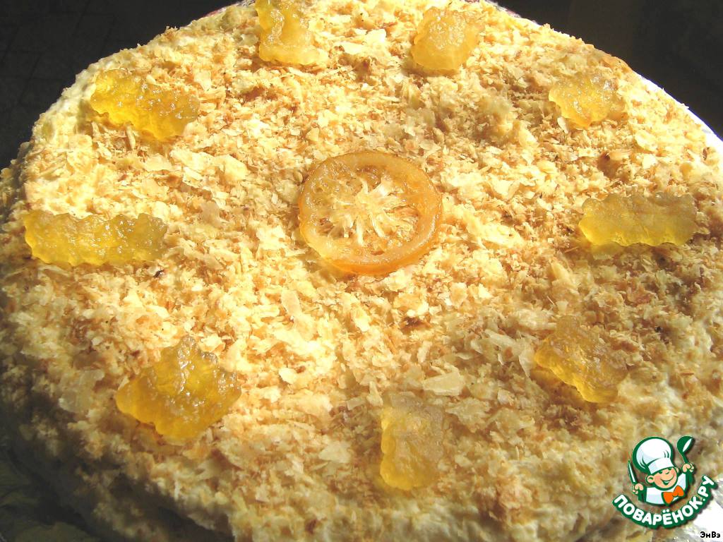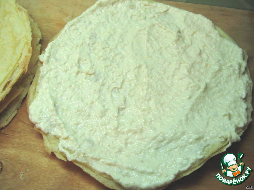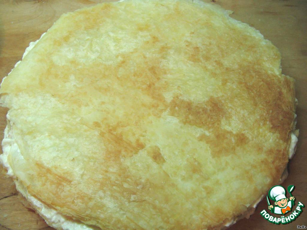 Последнюю, верхнюю лепешку, кладем обратной стороной вверх, под кремом ничего видно не будет, а поверхность будет ровной.