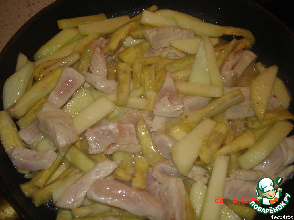 Теперь нарежем полосками грудку, замаринуем с перцем, солью, добавим немного сока лимона.