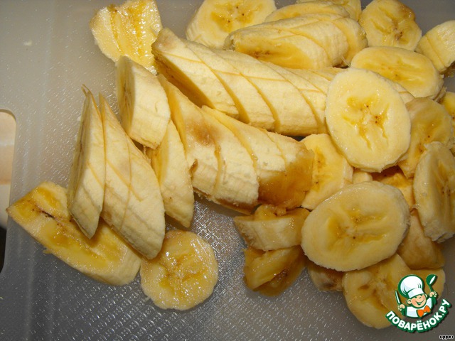 Бананы очистить и нарезать ломтиками наискосок, толщиной 0,5 см.
