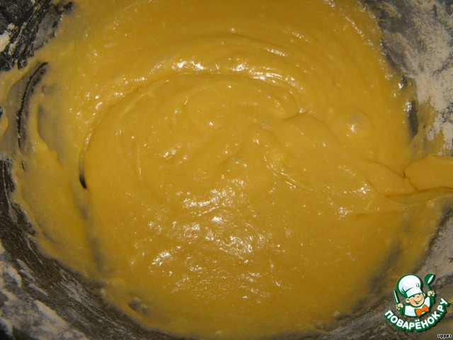 Добавить растопленное масло и по-немногу просеянной муки с разрыхлителем.