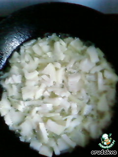 Делаем начинку. На сковороде растопить 30г сливочного масла, добавить растительного такое же количество. Мне нравится сливочное масло в сочетании с грибами – оно придает грибам какой-то свой неповторимый оттенок во вкусе. Добавляем нарезанный лук. Немного обжариваем, потом убавляем огонь и тушим минут 10 под крышкой, периодически помешивая.