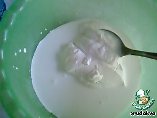 Готовим заливку. Берем 4 ст.л. сметаны, 8 ст.л. сливок, перемешиваем, солим, можно добавить приправы, но я считаю, что грибы не надо «портить» другими ароматами.