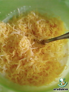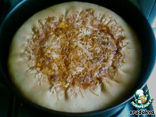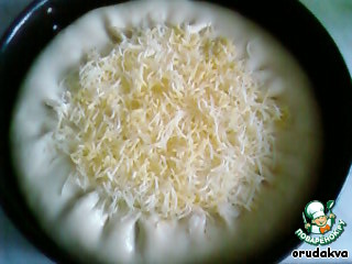 Края теста загибаем и собираем в мешочек. Сверху посыпаем тёртым сыром.