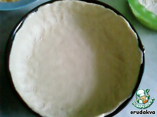 Собираем пирог. Форму (у меня 26см в диаметре) смазываем растительным маслом. Выкладываем тесто и разминаем его пальчиками по форме так, чтобы получились высокие бортики.