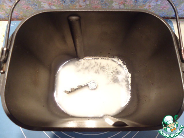 Для приготовления этого пирога сливочное масло, сливочный творожный сыр, яйцо и желток должны быть комнатной температуры, поэтому позаботьтесь об этом заранее. Дрожжевое тесто я, как и обычно, замешиваю с помощью хлебопечки, но если у Вас ее нет, можно тесто замесить и руками. В ведерко хлебопечки наливаю теплую воду, добавляю дрожжи и оставляю минут на 5-10.