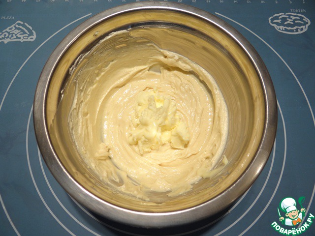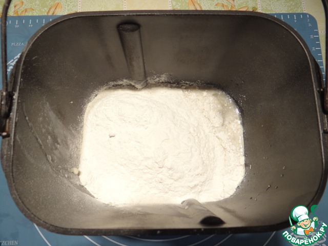 Добавляю остальные ингредиенты для теста - просеянную пшеничную муку, сливочный сыр, сахар, соль, сливочное масло, яйцо. Помещаю ведерко в хлебопечку, включаю режим замеса теста.