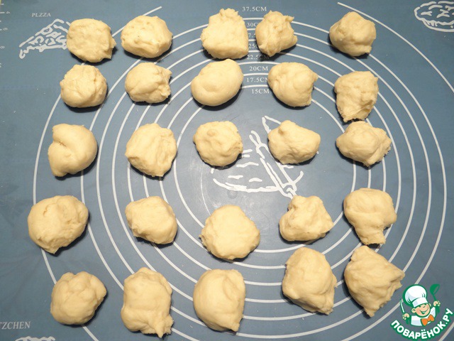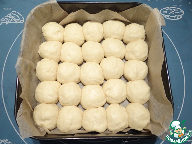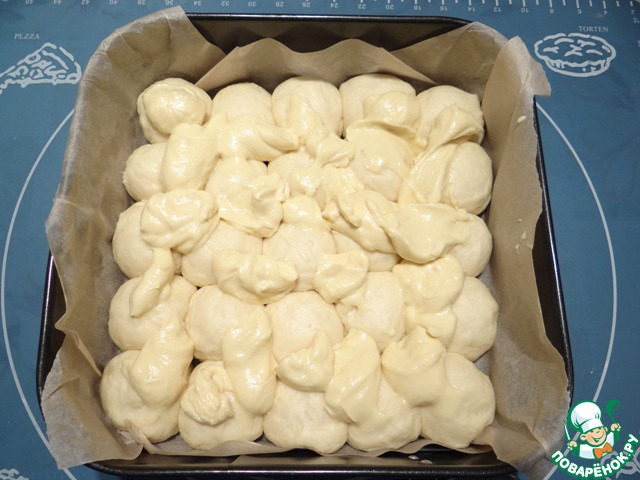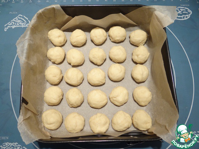 Квадратную форму (размер моей формы 24*24 см) застилаю бумагой для выпечки и смазываю растительным маслом (я не смазала, поэтому потом проблематично было снять ее с пирога, особенно снизу, т. к. пирог воздушный и нежный, при снятии бумаги он стал разделяться на "шарики"). Укладываю шарики из теста равномерно в форму. Можно использовать как квадратную, так и круглую форму для выпечки. Накрываю форму пленкой и даю тесту в теплом месте увеличиться в объеме в два раза.