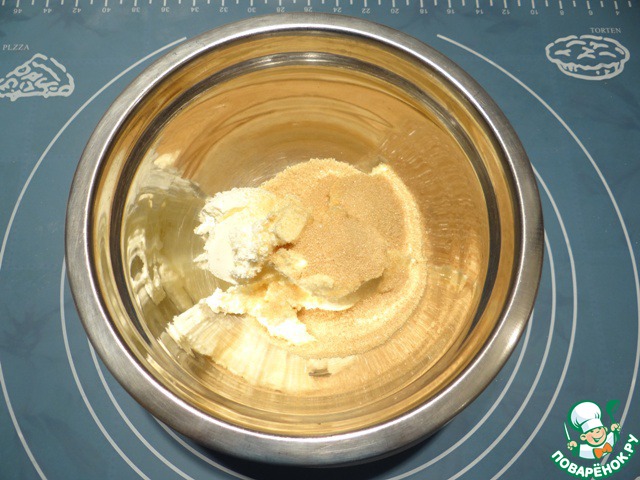 В это время готовлю крем. В миску кладу сливочный сыр и коричневый сахар