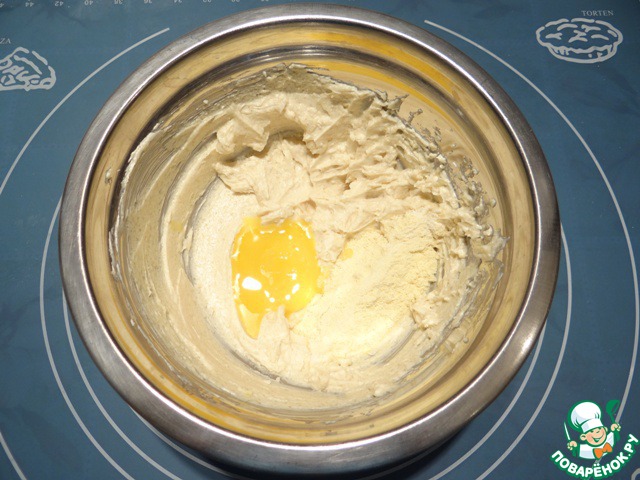 Затем добавляю просеянную кукурузную муку и желток. Снова взбиваю миксером около 30 секунд.