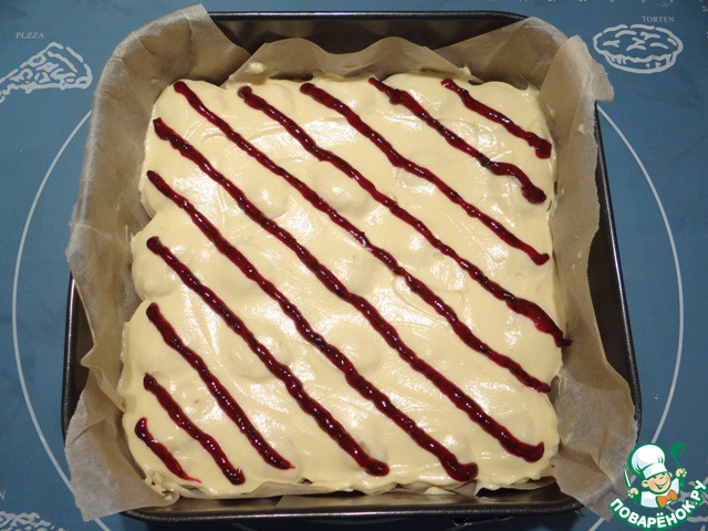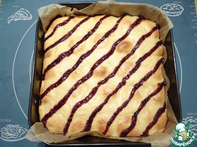 Для украшения пирога я использую домашнее варенье из черной смородины, только я его измельчаю с помощью блендера, т. к. попадающиеся иногда целые ягоды не будут проходить через насадку кондитерского мешка. Варенье перекладываю в кондитерский мешок или шприц, рисую по поверхности пирога линии.