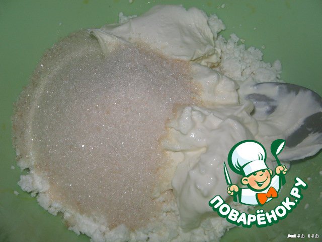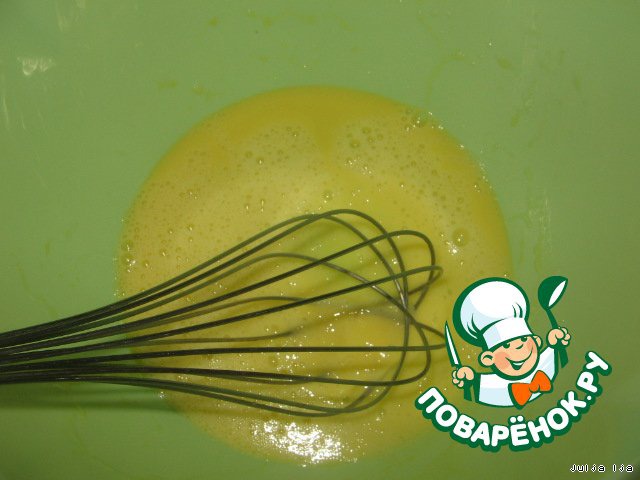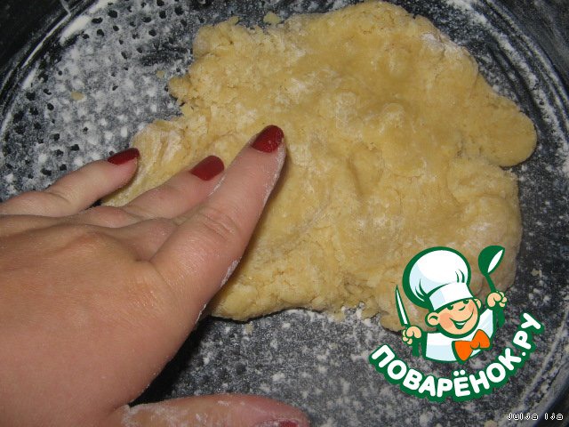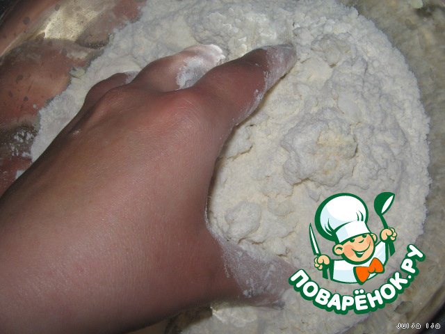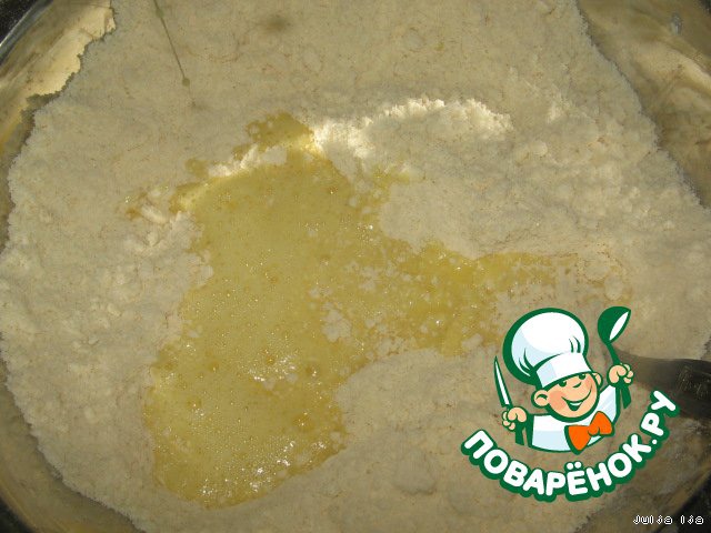 Добавить его в мучную смесь и вымесить тесто. Сначала всё будет рассыпаться, но нужно немного помесить и масса склеится.