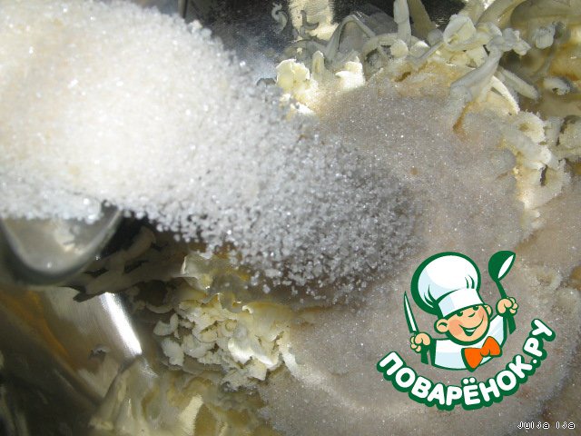 Добавить муку и растереть всё в крошку, руками или вилкой.
