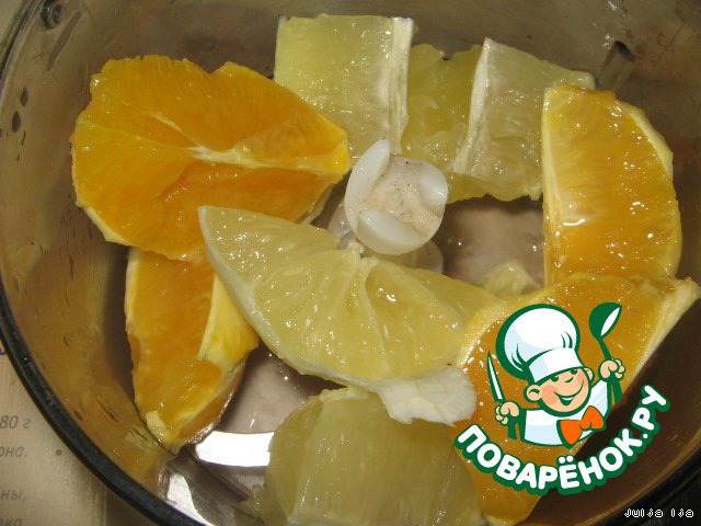 Тем временем, приготовить начинку. Очистить лимон и апельсин, измельчить в блендере или пропустить через мясорубку.