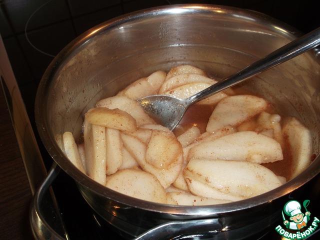 В кастрюлю с нарезанными грушами добавляем лимонный сок, 50 мл воды, 1 ст. л. сахара, корицу.