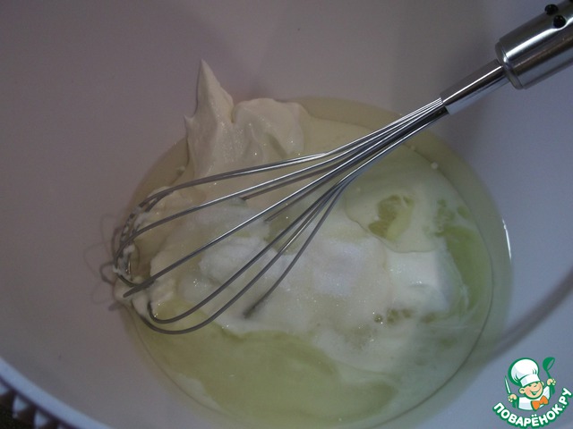 125 г творожной массы, растительное масло, молоко, белок яйца, щепотку соли и 4 ст. л. сахара взбиваем (перемешиваем) венчиком.