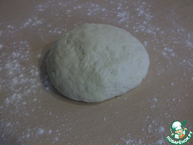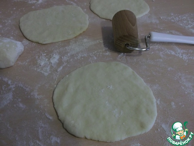 На подпыленной мукой рабочей поверхности раскатываем каждый кусочек (шарик) теста диаметром 12 см.