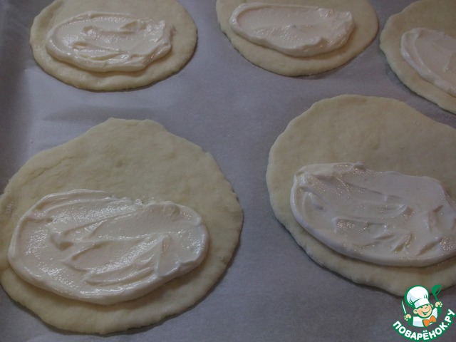 Раскатанные лепёшки, переносим на застеленный бумагой для выпечки противень.