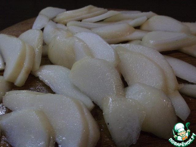 Груши чистим, разрезаем на четвертинки, удаляем семена и разрезаем поперёк пластинами толщиной 3 мм.