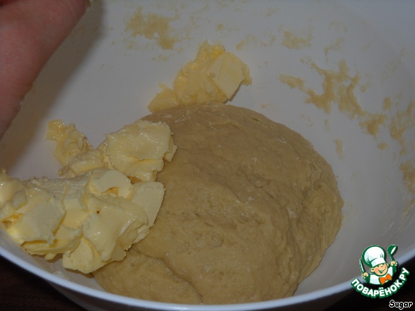 Масло нарезать кусочками и вбить в тесто, приподнимая его. На эту операцию уйдет несколько минут.