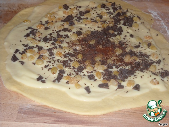 Посыпаем предварительно замоченным изюмом и нарезанным шоколадом.