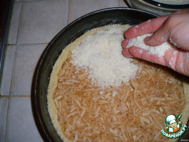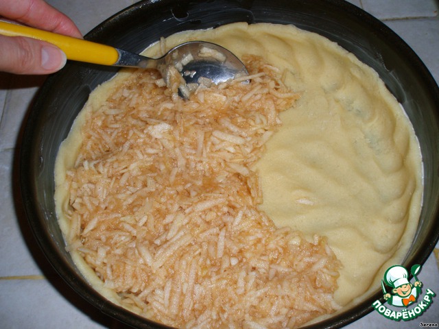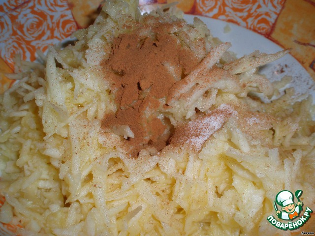Натереть на крупной тёрке, добавить сахар и корицу. Перемешать и отставить в сторону.