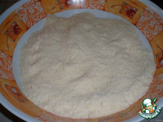 Получается вот такая крошка, которую делим на две равные части. В одну часть добавляем яйцо и замешиваем тесто. Если яйцо большое и тесто очень прилипает к рукам, то добавляем из другой части немного крошки.