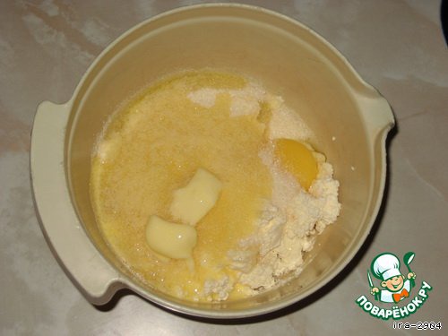 Творог, сахар, яйца, крахмал, ваниль, масло хорошо растереть, я делала блендером. По рецепту надо было отдельно взбивать белки от желтков, я забыла, но получилось и так не плохо. Еще, за неимением крахмала я добавила столько же манки, начинка получилась, как суфле (всем понравилось), позже попробую с крахмалом.