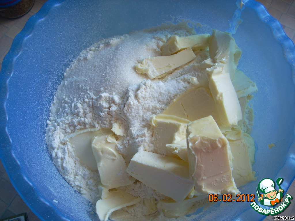 Просеянную муку смешать с 0,5 ст.л. соли и 2 ст.л. сахара. Добавить 250 гр масла комнатной температуры.