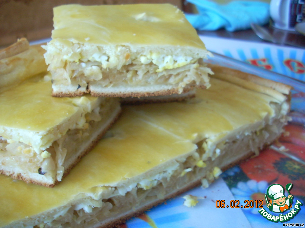 Выкладываем начинку: капусту, на нее сверху трем яйца.