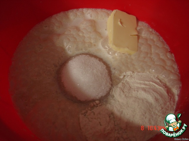 В теплое молоко добавить дрожжи и 1 ст.л сахара, пусть постоит 5 минут.