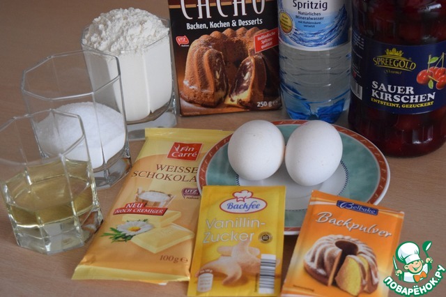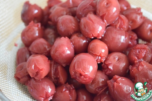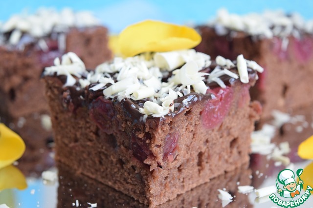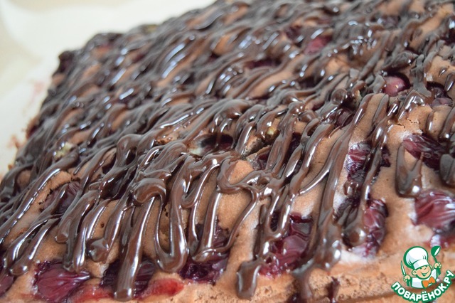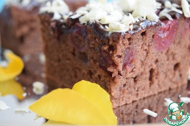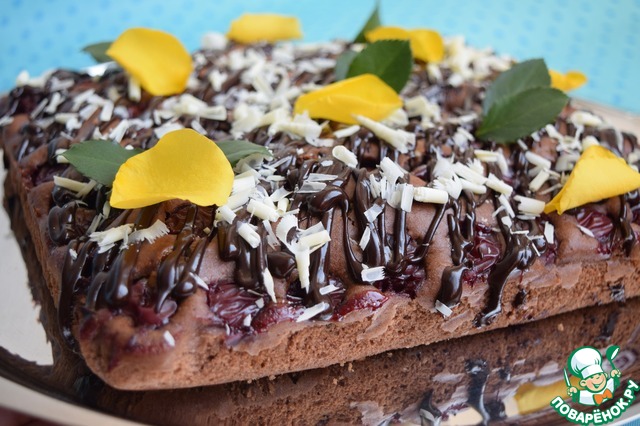 Форму 20*30 см, застилаем бумагой для выпечки и выливаем тесто. Сверху выкладываем вишни, вдавливая их в тесто.