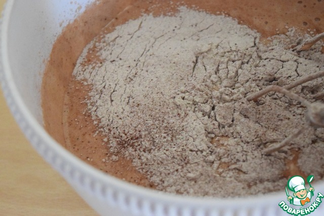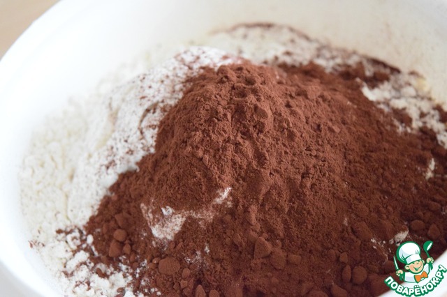 Смешать муку, разрыхлитель и какао. Просеять через сито.