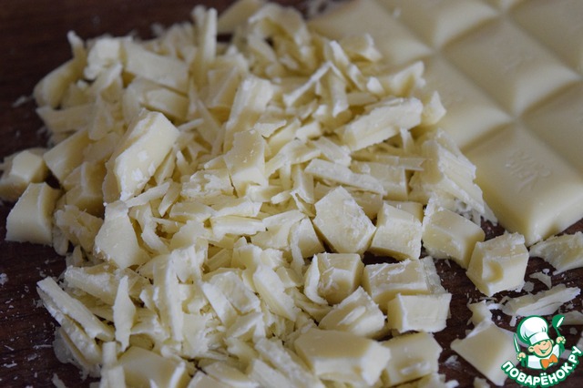 Шоколад рубим на крупные кусочки. Выбор шоколада за вами. В рецепте стоял или белый, или молочный шоколад. Но можно добавить и тёмный.