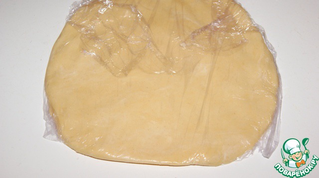 Скатать тесто в шарик. Поместить в пищевую плёнку и расправить в лепёшку, отправить на ночь в холодильник (минимум на 3 часа).