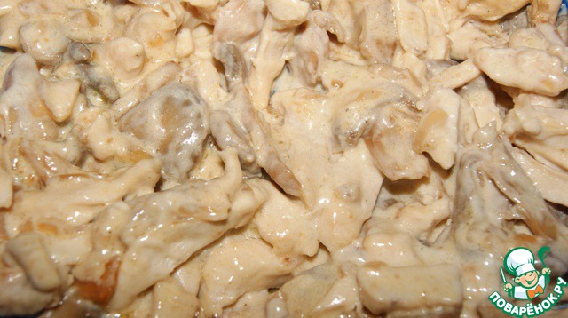 Добавить филе, залить сливками. Тушить 5 минут, чтобы сливки хорошо загустели. Остудить.