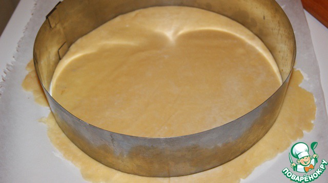 Достать тесто из холодильника и раскатать, поместив между двух листов пекарской бумаги, присыпанных мукой, в круг 32 см в диаметре.