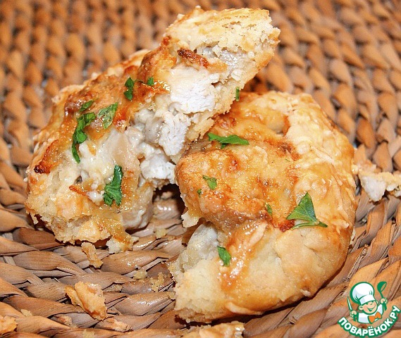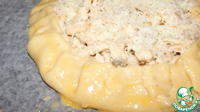 Отступить от края 3 см, в центре поместить начинку. Накинуть края теста на начинку, делая защипы. Смазать тесто яйцом и посыпать всю галету сыром, в том числе и тесто.