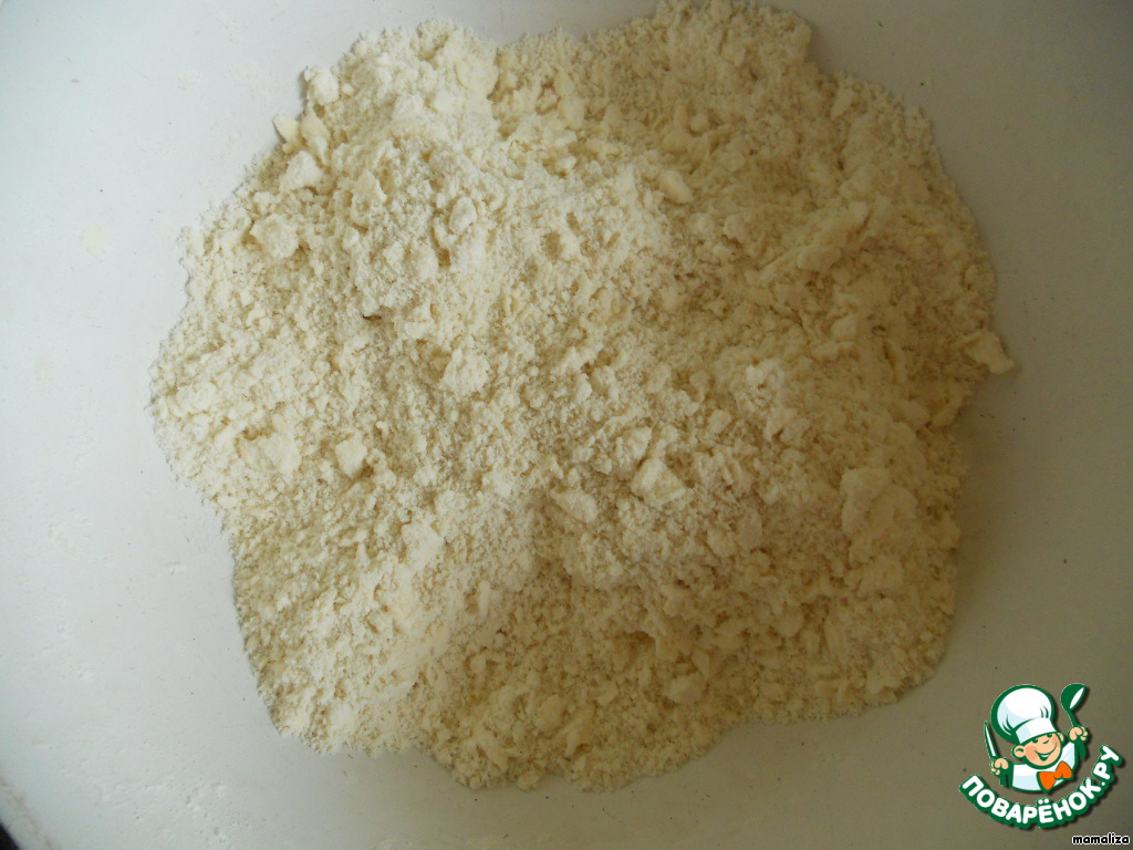 Приготовим рубленое тесто. Для этого замороженное масло порубим ножом вместе с мукой в мелкую крошку.