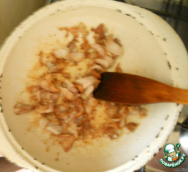 Грудинку измельчим и обжарим на сковороде. Лучше чугунной. В вытопившемся сале пожарим очищенный и измельченный лук до мягкости и прозрачности. Добавим сахар, уксус, перец, орегано (или базилик).
