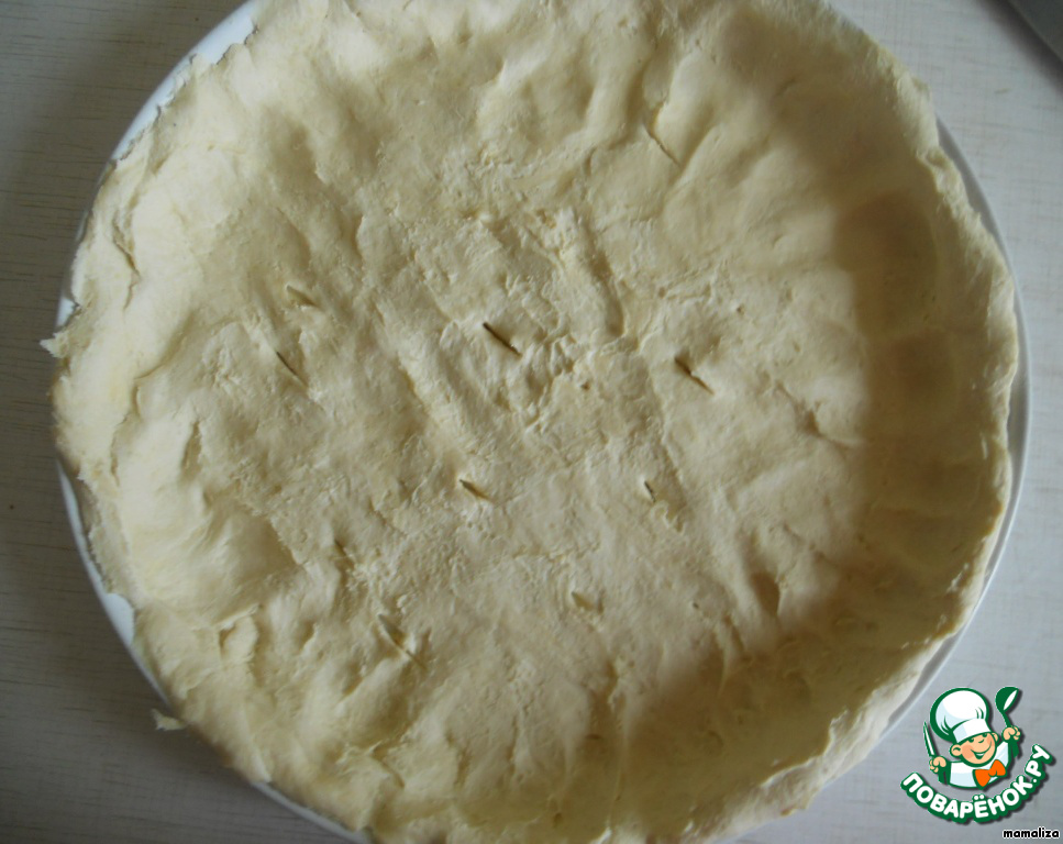 Охлажденное тесто выложим в форму для запекания, наколем вилкой. Тесто запечь в духовке примерно 20 минут до легкого зарумянивания.