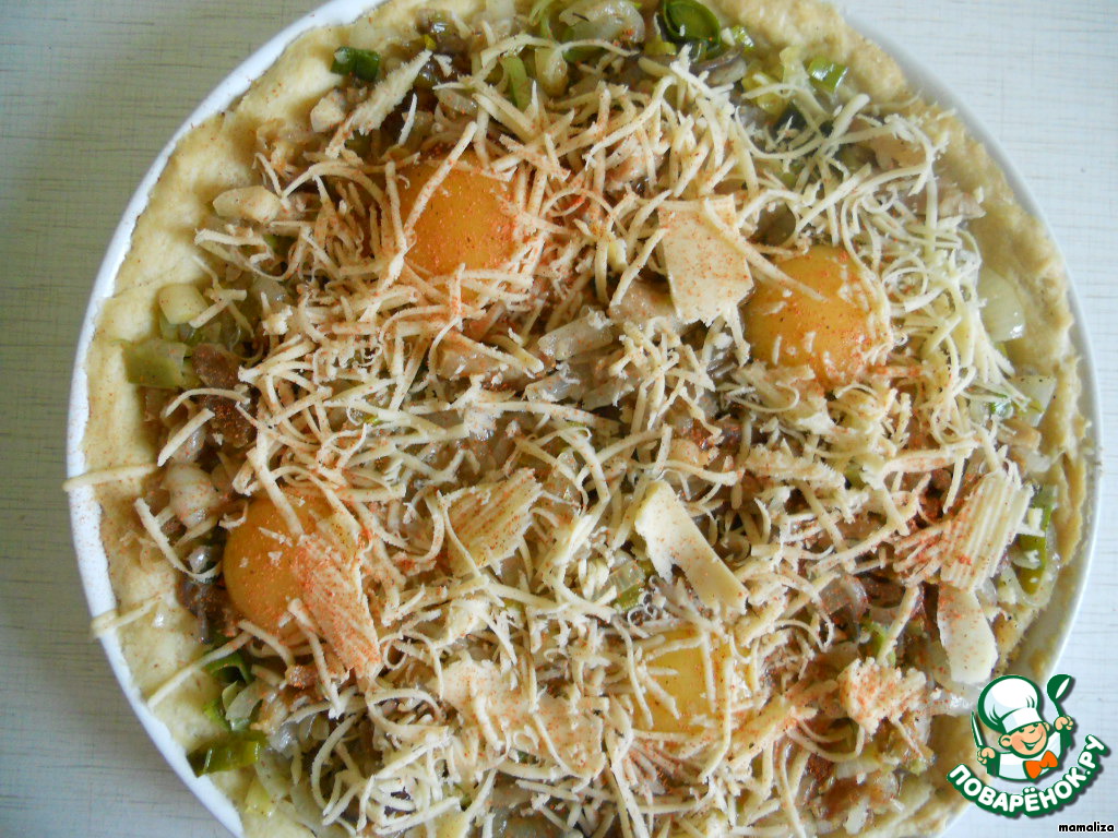 Выложить луковую начинку на испеченную основу. В начинке сделать 4 углубления и вылить в них по одному яйцу. Начинку слегка посыпать тертым сыром и красным перцем.